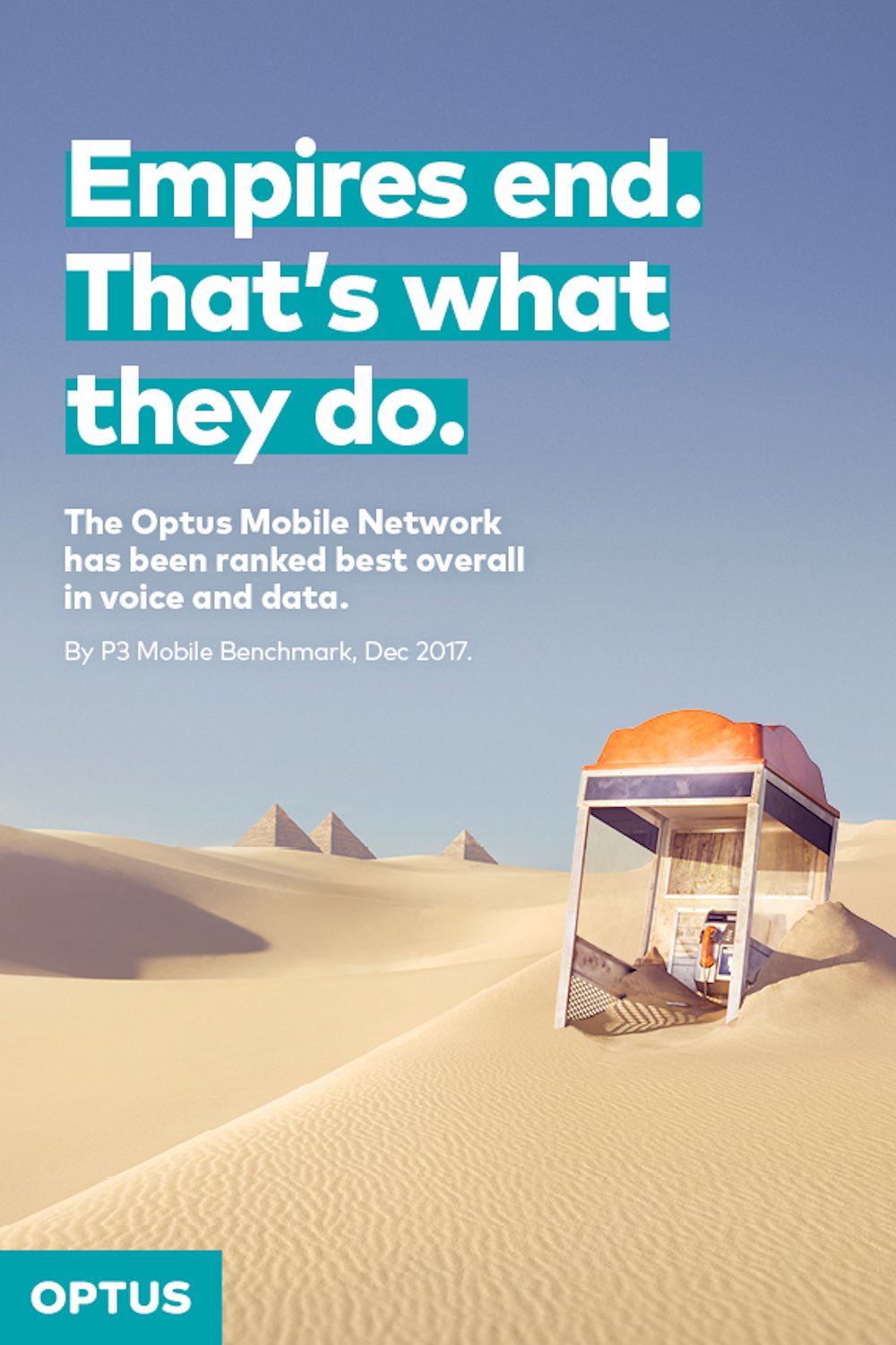 Optus的户外和在线宣传活动由其内部的Yes Agency发起,宣传内容是一个被毁在沙漠中的澳大利亚电信电话亭,标题是:“帝国终结”。这就是他们所做的”,然后是“Optus移动网络在语音和数据方面的综合排名是最好的。”