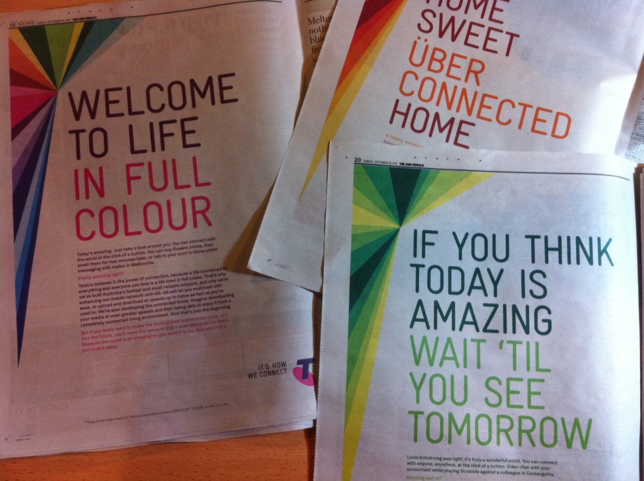 撇开绝妙的彩色美学不谈,澳洲电信想告诉我们什么?他们现在跟我更有关系了,因为他们升级了他们的涂装?啐。此外,TVC中的副本是如此类别通用,它可以用于任何涉及网络的业务。史诗般的失败。