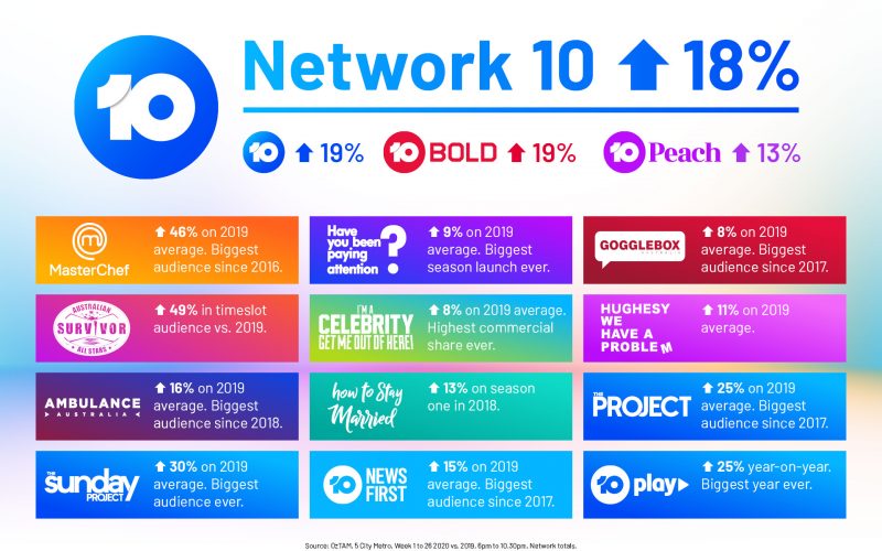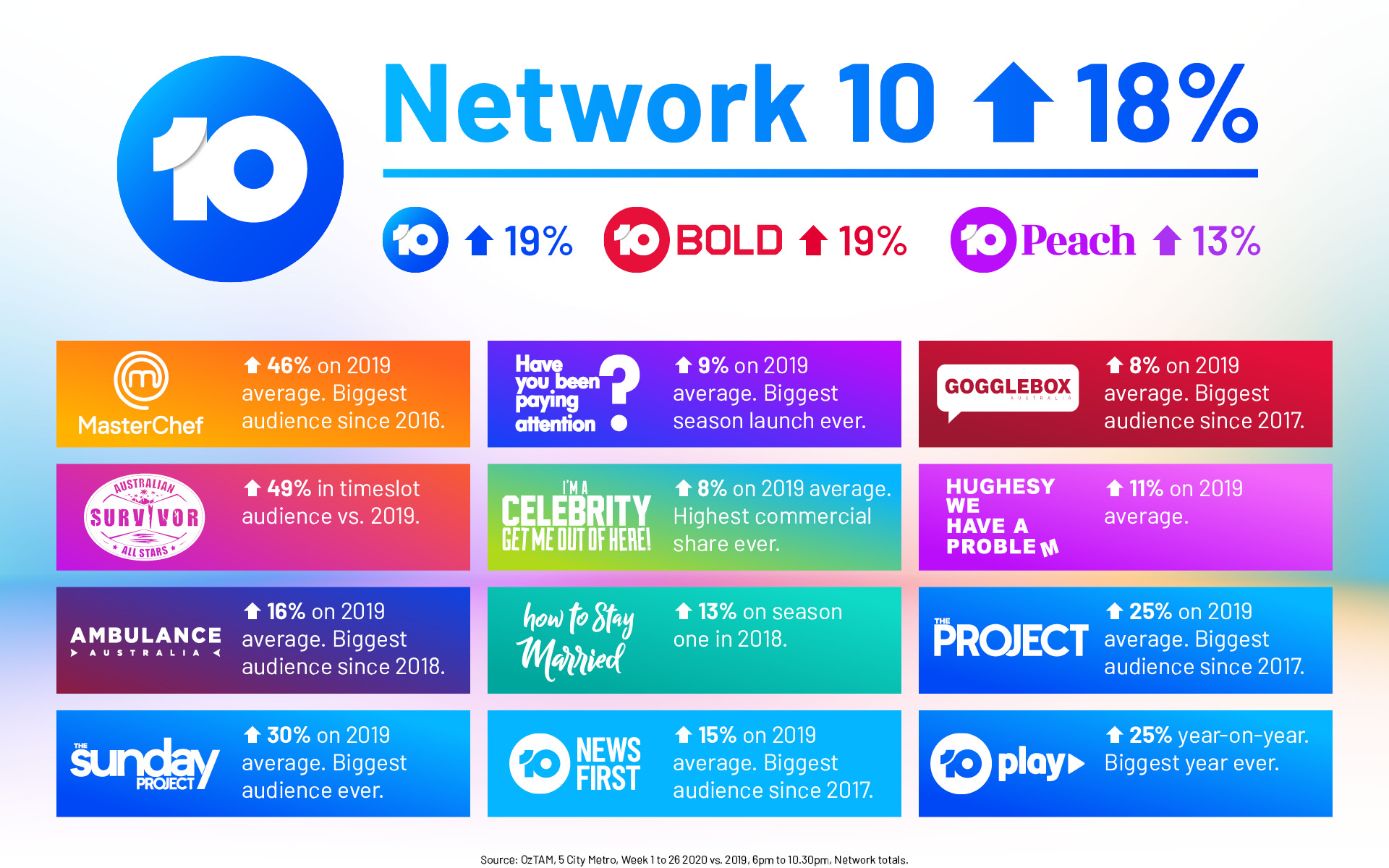 十在黄金时段的总人商业份额上升了25.8%,创下2011年以来最大。总人从下午6点到午夜是25.6%,再一次,自2011年以来最大的。十个关键广告人口也表现良好。截至6月底,网络拥有30.6%的50岁以下的商业与观众分享,16-39s是25 - 54的30.4%,32.0%和31.3%在18 - 49岁。
