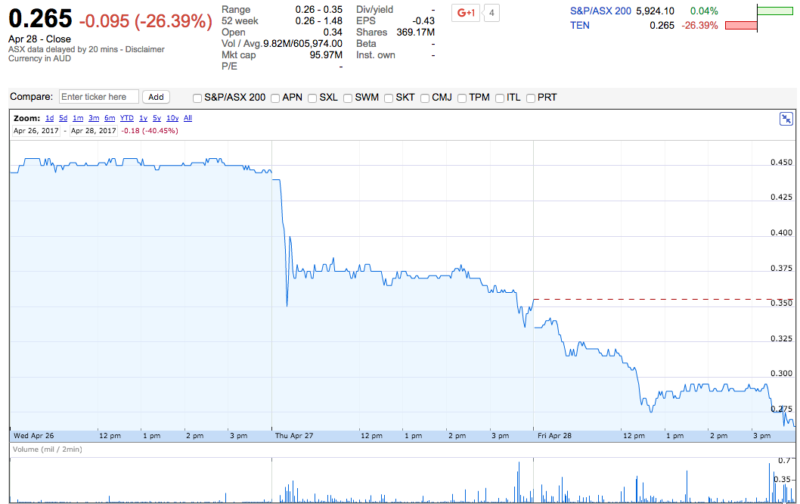 趋势在周五继续进行,惊慌失措的投资者抛弃了十个,使股价从营业时间达到36美分到收盘价为26美分,比公司的价值赚了26.3%。