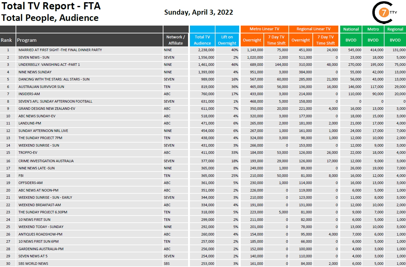 在最新的日常综合总电视报道4月3日,周日的决赛宴会事件对我们是# 1在线性计划在全国范围内,有223.8万观众,其中包括414000 BVOD和40%的提升。