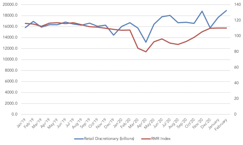 它也与酌情零售花了很强的相关性。看着同一时期的ABS零售数据,当信心上升时,我们看到零售支出上升,反之亦然。