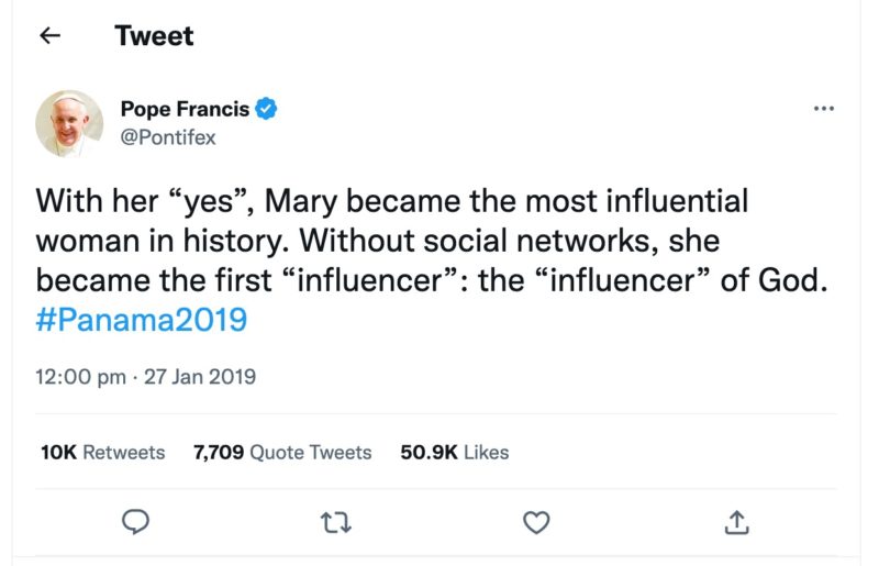 谈到宗教,与13亿多名信徒受到天主教的教义,教皇弗朗西斯(1960万Twitter追随者)给我们的历史书和他的推特在2019年宣布玛丽“第一“影响者”。