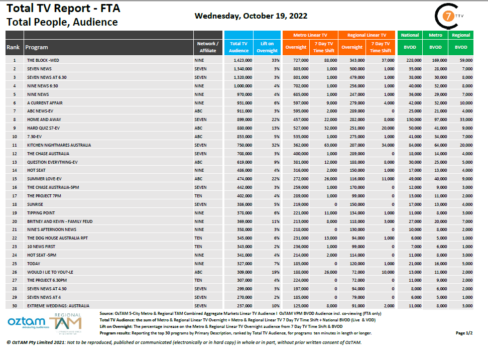《The Block》在周三晚间娱乐节目中高居榜首,《Nine》以29.6%的份额赢得了总冠军。