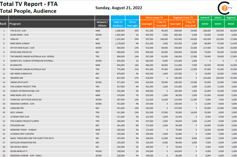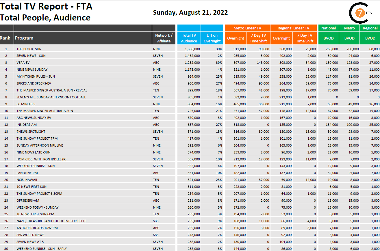 在8月21日最新的每日综合电视总报告中,周日的《街区》是全国收视率第一的节目,有166.6万观众,包括BVOD的26.8万观众,上升了30%。本周收视率上升幅度最大的是ABC电视台的一集《Vera》,收视率上升了39%,共有125.2万观众收看。