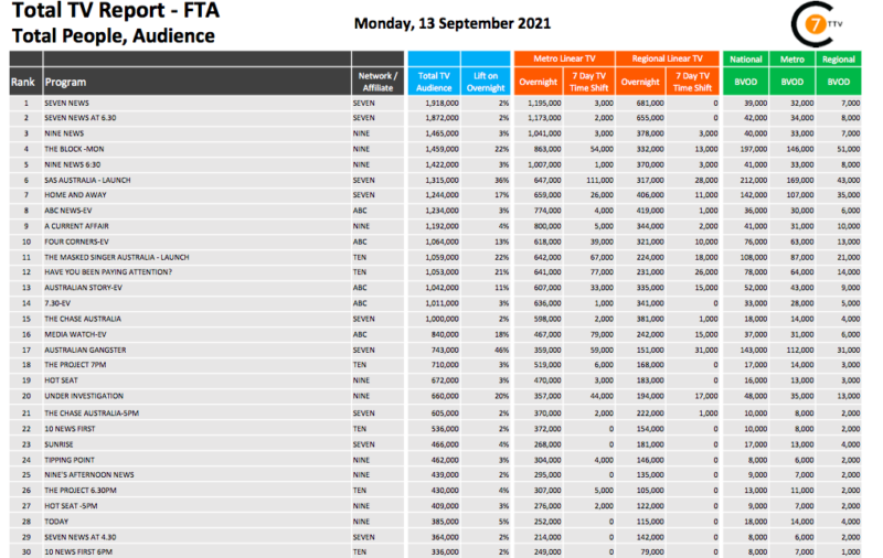 在9月13日最新的《每日综合电视总报告》中,Seven News是全美线性和BVOD电视节目中排名第一的节目,拥有191.8万观众,其中BVOD观众为3.9万人。