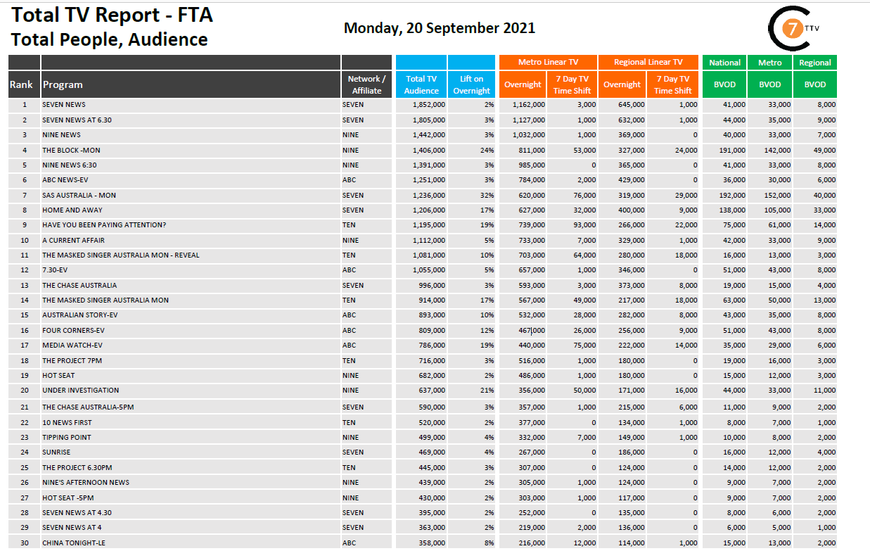 在9月20日最新的每日综合电视总报告中,Seven News是全国线性和BVOD电视节目中排名第一的节目,有185.2万观众,其中BVOD观众4.1万。