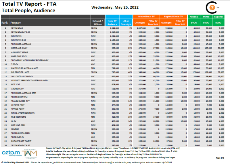 在5月25日最新的《每日综合电视总报告》中,Seven News以164.4万的总电视观众位居榜首,其中BVOD的观众增加了3%,达到4.1万。《老大哥七频道》的某一集收视率达到了当晚的最高水平,达到48%,共有79.5万电视观众观看。