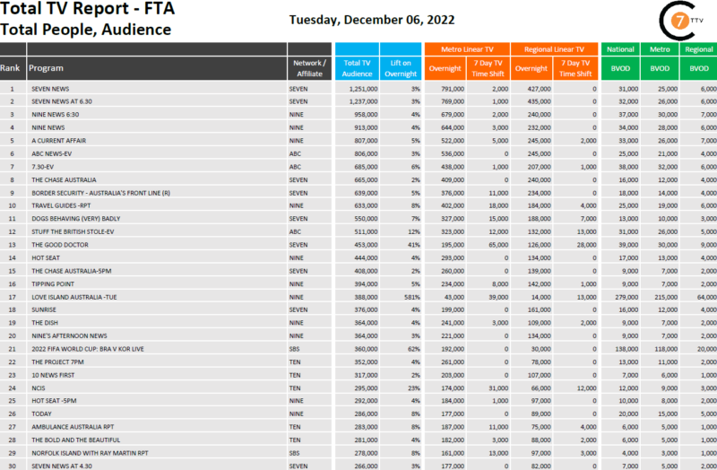 在12月6日周二最新的每日综合电视总报告中,Seven News是全国排名第一的节目,有125.1万观众,其中包括31000名BVOD观众,上升了3%。本周涨幅最大的是《九号澳大利亚爱情岛》,涨幅达581%。