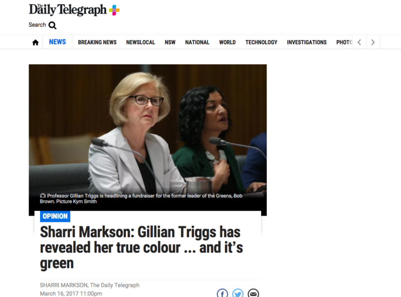 布朗的抱怨围绕着3月17日发表的一篇题为《特里格斯:绿党的Gig》的文章,以及第二篇题为《特里格斯的抱怨者:人权负责人是格林的耻辱》的文章,以及莎莉·马克森的一篇题为《特里格斯的耻辱》的在线观点专栏“吉莉安·特里格斯暴露了她的真实肤色……是绿色的。”.