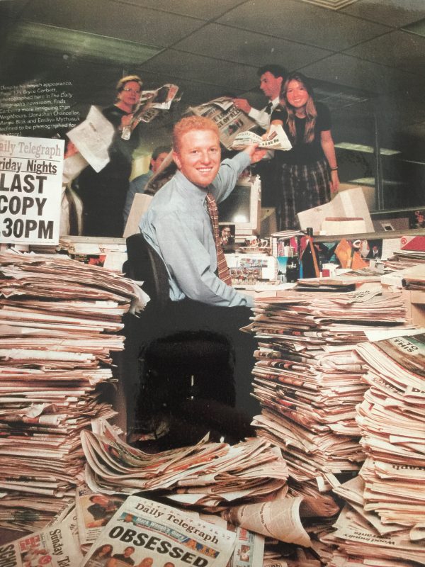 我的第一篇头版文章是关于一个警察男孩俱乐部(PCYC)交易类固醇的,这是一个亮点。我还记得在一台旧打字机上敲出的介绍。“警方正在调查他们男孩俱乐部的青少年成员被出售合成代谢类固醇的指控。”这是一个巨大的刺激。当你在新闻楼层时,你还是会有那种肾上腺素的冲动。新闻和团队合作是《每日电讯报》的基因。