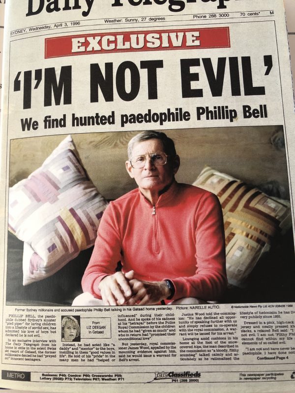 上世纪90年代末,我被派往英国,为我们的都市日报和周日报纸网络担任欧洲记者。这是一次非凡的新闻冒险,报道戴安娜的死亡和葬礼是我最难忘的。但我最自豪的故事是在瑞士找到被通缉的百万富翁恋童癖菲利普·贝尔。他被伍德皇家委员会调查警察腐败,在新南威尔士州警方告诉委员会找不到他的第二天,我们在头版看到了他坐在瑞士小木屋里的照片,还有一篇完整的采访,他承认自己喜欢男孩,但否认这是犯罪。