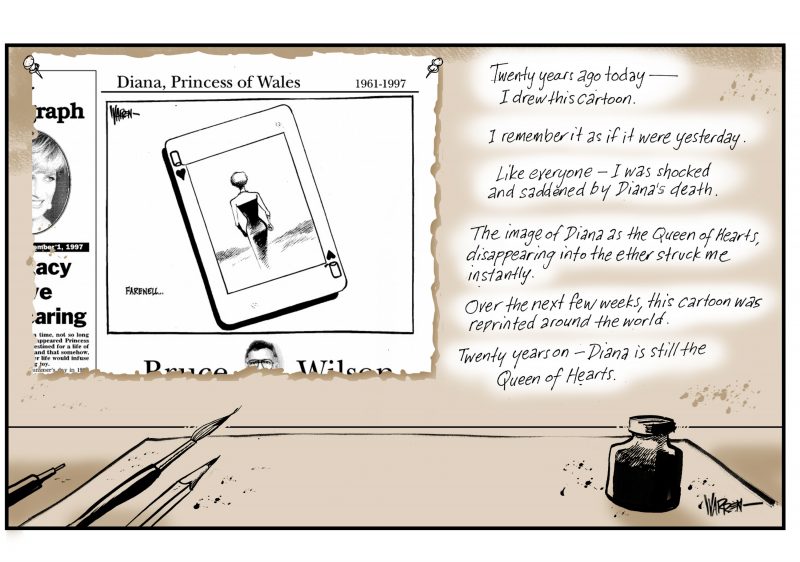 当时我正在家里和一群朋友吃晚饭,突然传来戴安娜去世的消息,令人难以置信。出于某种原因,创作一部漫画的想法瞬间闪过我的脑海。我找了个借口,直奔办公室,画了一幅微妙而有力的肖像,画的是优雅的戴安娜穿过一种雾霾离开我们,这是红心王后纸牌的中心图案。在接下来的几个星期里,这幅漫画在世界各地重印。就在这一刻,这张照片不知从哪儿冒出来的——这是一种情绪上的反应,正好赶上了那个时候……