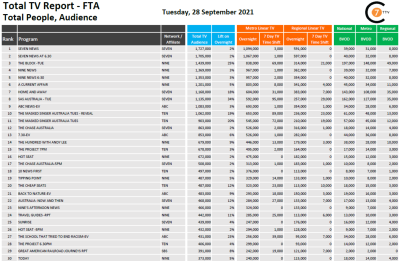 在9月28日最新的每日综合电视总报告中,Seven News是全国线性和BVOD电视的第一节目,有172.7万观众,其中BVOD有3.9万观众。
