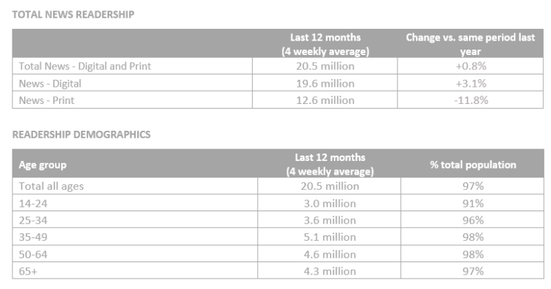 罗伊·摩根(Roy Morgan)为ThinkNewsbrands制作的读者数据是指截至2022年6月的12个月,并表明总新闻达到了14岁以上人口的97%。Total News代表印刷和数字和独立新闻网站的所有新闻品牌都是一个媒体频道。