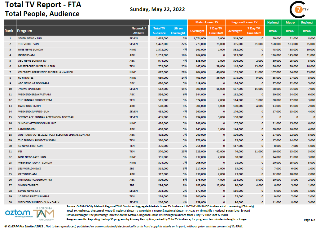 在5月22日的最新电视综合报告中,周日的《七新闻》是全国线性节目中排名第一的节目,有166.5万观众,其中BVOD有3.9万观众,收视率上升了3%。本周涨幅最大的是《澳大利亚名人学徒》首播集,收视率上涨29%,共有69.7万观众收看。