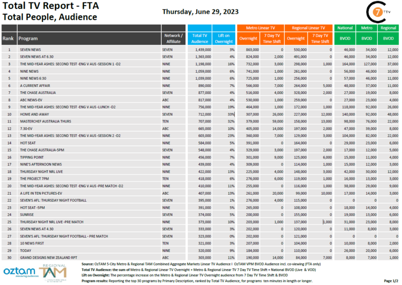在最新的每日汇总7总电视报道,6月29日7新闻# 1项目总143.9万电视观众,与国家BVOD和46000年提高3%。