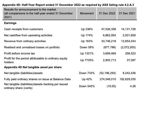 截至2022年12月31日的半年,集团经营活动净现金流增长174%,报告经营活动净现金流入680万美元。