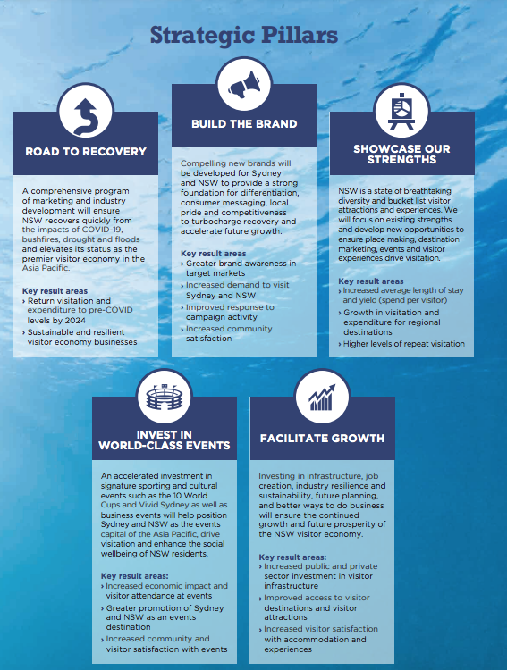 该战略概述了新南威尔士州旅游业复苏的路线图,并设定了到2030年新南威尔士州成为亚太地区首要旅游业经济体和游客支出达到650亿美元的目标。