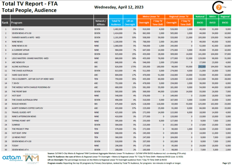 最新合并7总电视报道4月12日,# 1项目七新闻电视观众总数为148.2万,其中包括40000年国家BVOD和提升3%。
