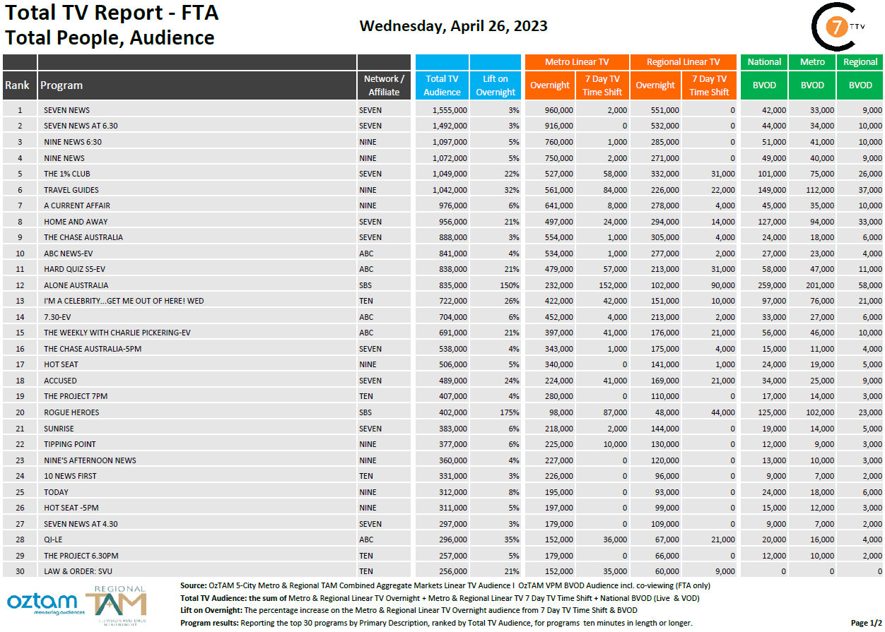 而且在最近每天巩固7总电视报道4月26日,七新闻# 1程序上星期天全国电视观众总数为155.5万,其中包括42000 BVOD和3%的提升。