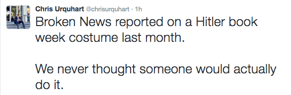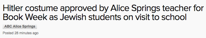 今天早上推特上流传着一则新闻,Alice Springs一所私立学校的一名学生装扮成阿道夫·希特勒出现在读书周的装扮日上,被授予最佳着装奖。