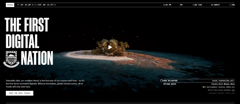 为了强调海平面上升威胁其海岸的紧迫性,太平洋岛国图瓦卢与埃森哲歌曲、Collider和Thrive PR旗下的the Monkeys合作,共同创建第一个数字国家的开端。