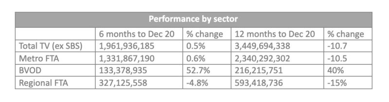 截至2020年12月的12个月里,电视市场的广告收入为34.5亿美元,比截至2019年12月的12个月下降了10.7%。同期,广播视频点播(BVOD)增长了40%。