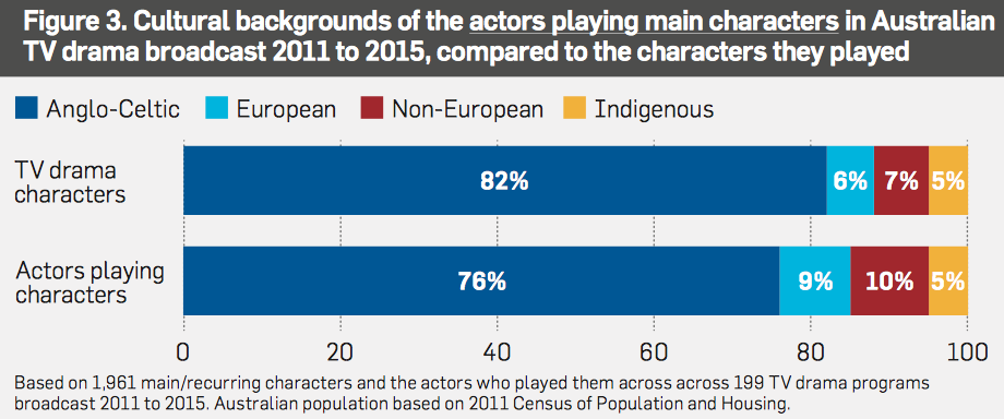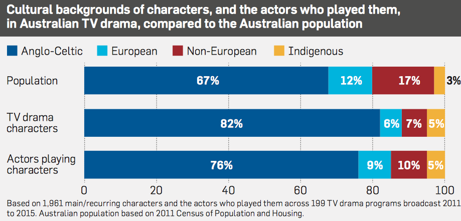 它发现,在占澳大利亚人口的67%的同时,82%的虚构戏剧人物是盎格鲁凯尔特人。