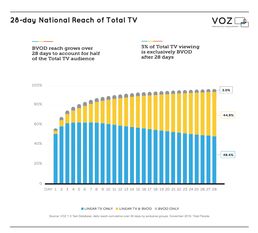 OzTAM今天,区域TAM和尼尔森发布新的VOZ数据库的“营收的发现”,并指出,85%的澳大利亚人看广播电视每周近四分之一的手表BVOD。BVOD观众,它说,有一个15年平均年龄低于线性电视55 - 40 BVOD和线性电视。,只有4.2%的人每周只看BVOD——也就是说,没有线性的电视。