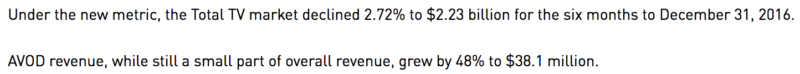 据认为电视的新指标,总广告支出在电视行业在2016年的最后六个月为22.3亿美元,它说的是一个比前一年同期下降2.72%。
