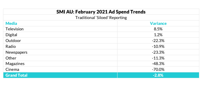 在澳大利亚的广告花费5579百万美元,占2月份的55790万美元,这是一个改进根据标准媒体索引(SMI)数据,1月份跌破-7.3%。