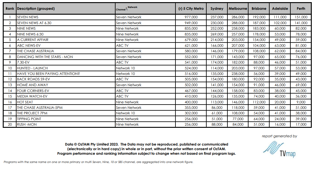 毫不奇怪,追逐澳大利亚赢得了与新闻无关的内容,晚上画580000地铁观众,与《与星共舞》也评价了七,把整个五都市区552000观众。