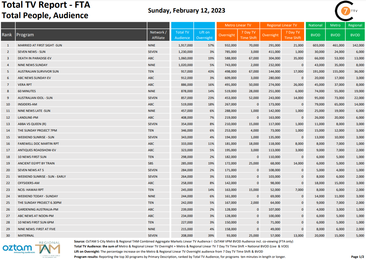 在截至2月18日的2023年第一个调查周里,Nine以31.1%的比例成为整体网络赢家,其次是Seven (26.5%), ABC(18.1%)和Ten(15.9%)。