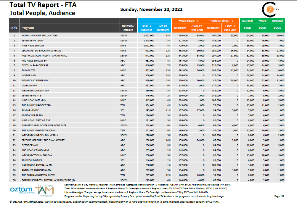 In the latest Daily Consolidated Total TV Report for 20 November, the special airing of Kath & Kim: Our Effluent Life on Seven was the #1 program nationally across linear, with 1.402 million viewers, including 124,000 on BVOD and an uplift of 18%.
