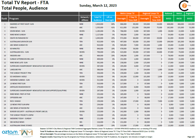 最近每天巩固7总电视报道3月12日,加九上周日是# 1项目全国电视观众总数为192万,其中包括608000 BVOD和最大的提升60%。