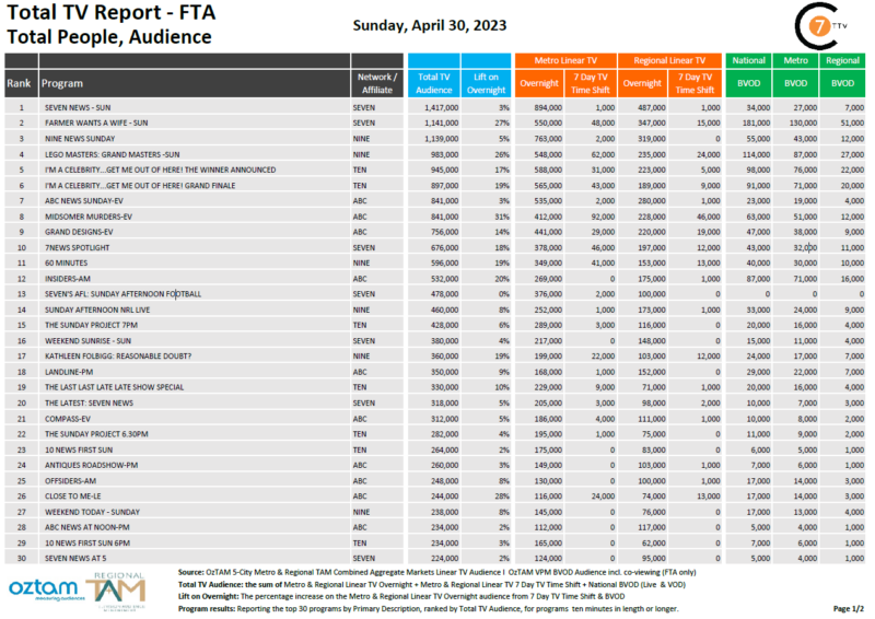最近每天巩固7总电视报道4月30日,7新闻上周日是# 1项目与141.7万年地铁观众上升了3%,在国家BVOD和V。