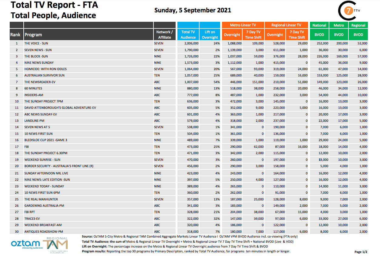 根据第一份报告,9月5日星期日的最高收视计划是七个声音,其中有2006万名全国观众在BVOD上包括252,000,这是该日期播出的任何计划中最大的。