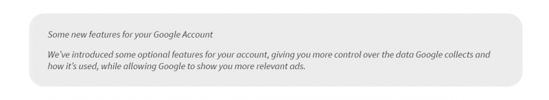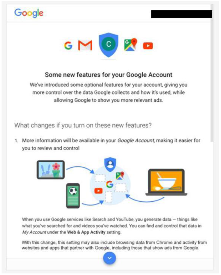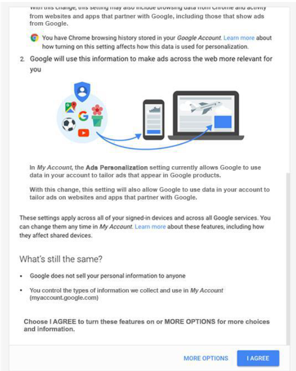 “ 2016年6月,我们更新了广告系统和相关的用户控件,以匹配人们使用Google产品的方式:跨许多不同设备。我们所做的更改是可选的,我们要求用户通过突出且易于理解的通知同意。