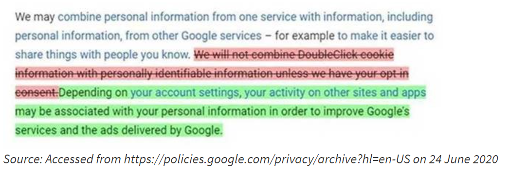 2016年6月之后,当消费者点击“我同意”通知时,Google开始收集和存储有关Google帐户持有人在线活动的个人身份信息,包括使用第三方网站和不拥有的应用程序由Google。