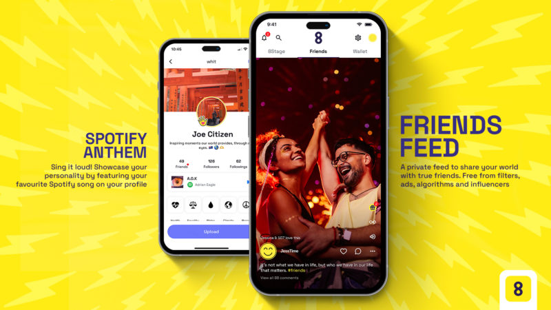 此外,WeAre8还推出了一系列新功能,包括没有广告、算法和过滤器的“好友推送”(Friends Feed)。该平台还与Spotify合作推出了音频功能,允许用户在他们的账户上添加一首个人歌曲,