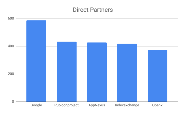 谷歌正如所预期的那样,是最受欢迎的“直接”合作伙伴。在2000年的网站上,Google已被列入出版商Ads.txt文件的直接合作伙伴以上超过2,470次。大约98%的发布商使用谷歌将其流量批准。