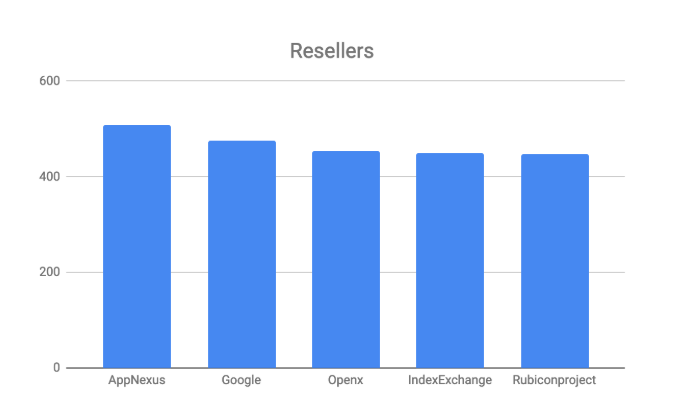 令人惊讶的是,AppNexus是最常用的经销商,根据顶级出版商的Ads.txt文件。谷歌和openx完成了前三名。