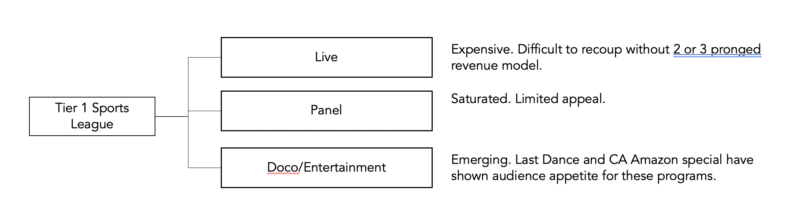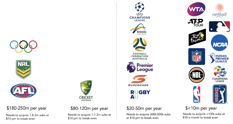 内容的重要性,体积是至关重要的。再次,附加一个一级运动给你一个大的观众钩。这个不适合流媒体的经济学,你每个月需要多个收购的时刻。加上击倒边——一级联赛,它有一个引人注目的收购这些联盟的球迷。