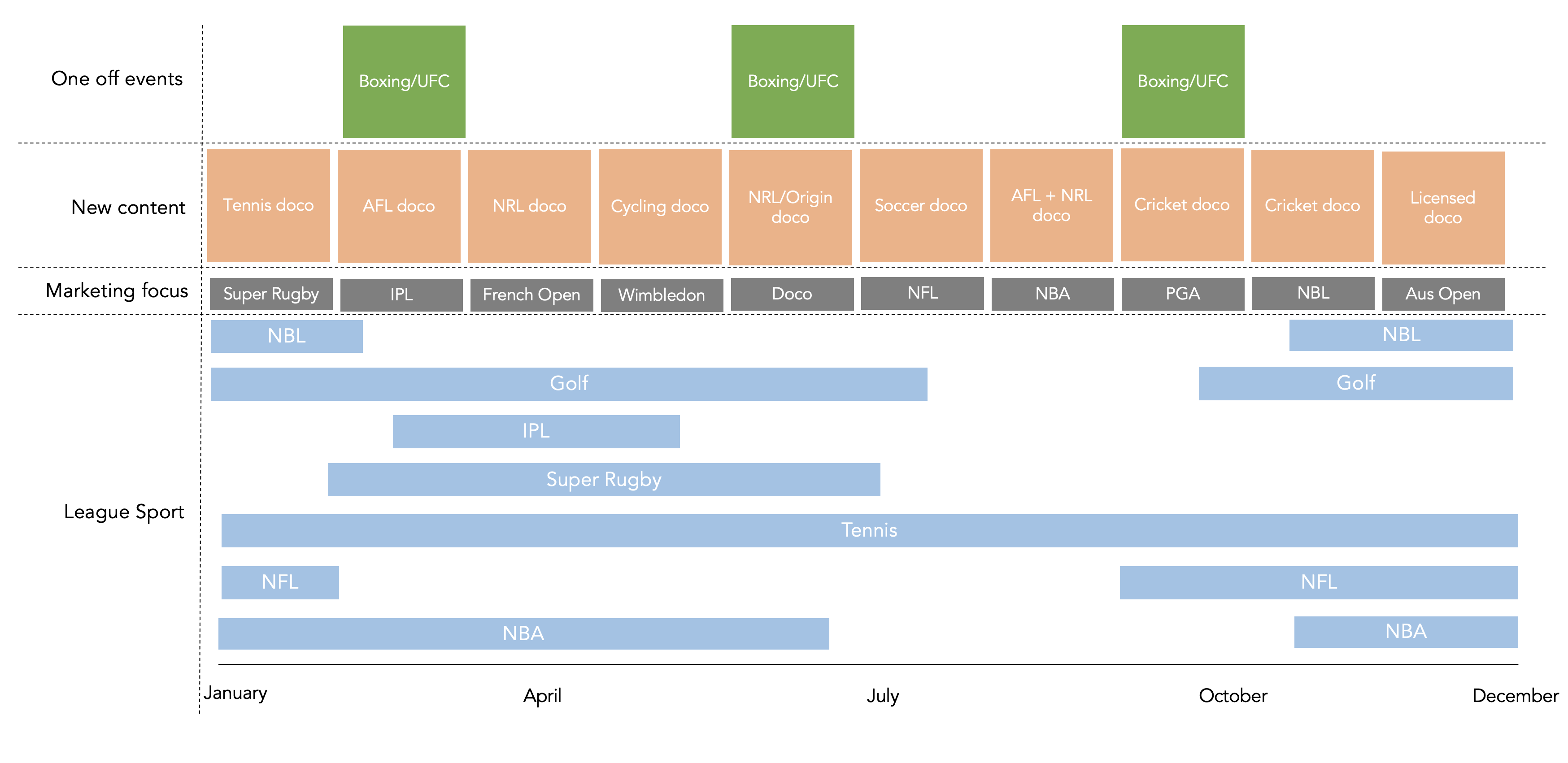 该基金会是联盟内容的深度和广度。这给你全年的深度报道,它给你许多收购钩子,它提供了12个月的持续的内容。这些联盟的交错性质提供了营销集中在整个赛季开始,全年决赛…,10 - 12为一致的收购提供了一个良好的基础营销。橄榄球,温网和法网提供这个。网球、NBA、橄榄球、创新、亚洲冠军联赛,落网球、高尔夫和联赛的IPL将提供足够多的市场。