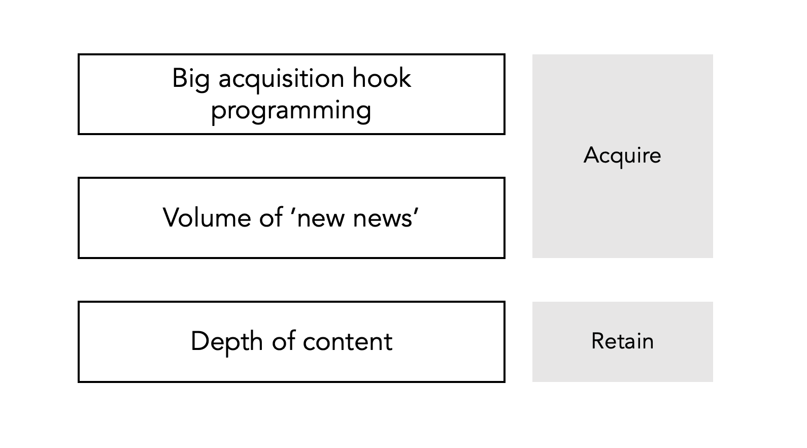 SVOD有两个目的——获得一个新的订户或持有。它不一样关心体积,或一个程序是否可以得到600000观众。所以重点是有趣的内容,可以推动行动-注册或能证明价值和用户。