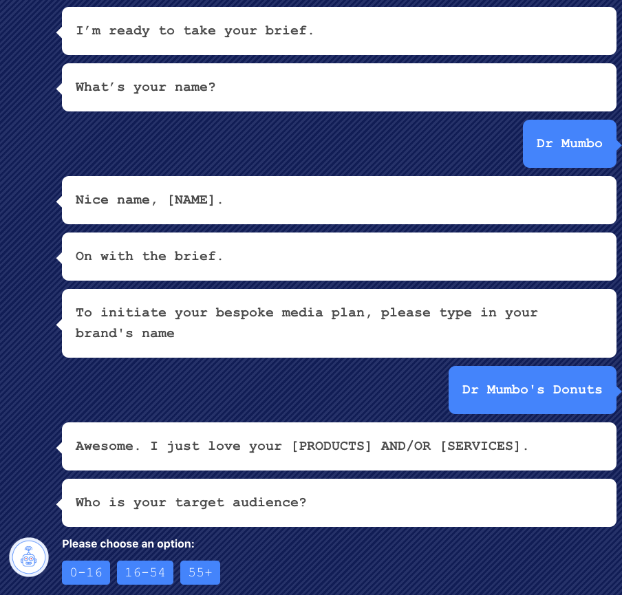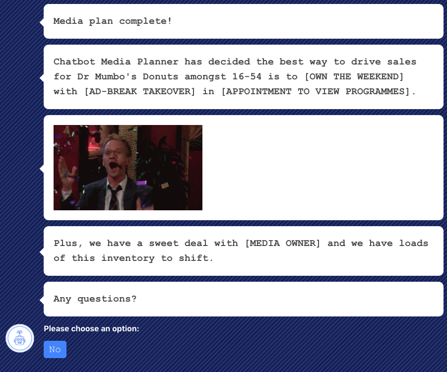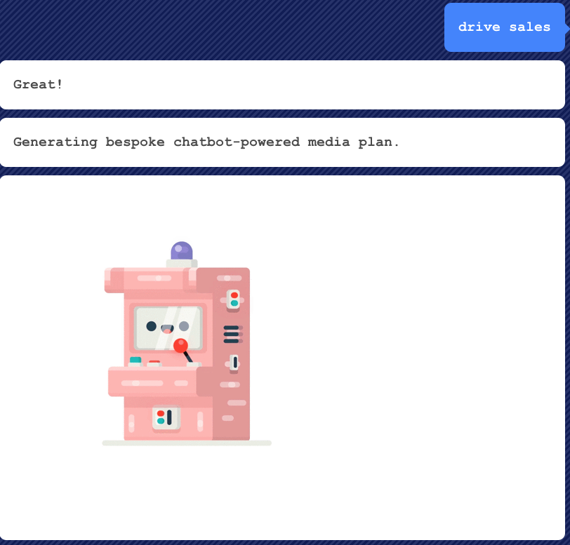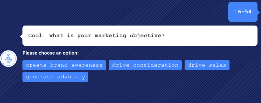 读到这些,我咯咯地笑了,还玩起了聊天机器人。虽然这是个吸引顾客的好角度,但考虑到时间和数据,我很确定chatbot将会为大多数人提供一个出色的媒体计划。