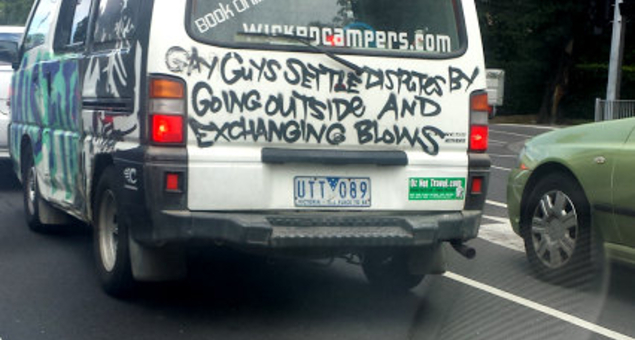 第二个口号是“男同性恋通过走到外面互相殴打来解决争端”,被一名律师认为是恐同发牢骚的人。