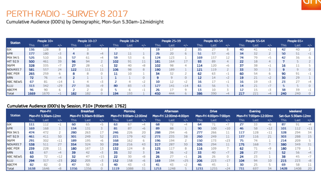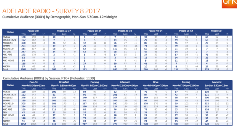 在最新的调查中,Nova的阿什·布拉德南、基普·怀特曼和大卫·卢特尔的早餐和苏茜·奥尼尔的节目以14.1%的份额领先于Hit105的艾比·科尔曼、斯塔夫·戴维森和马蒂·阿克顿的10.9%的份额。