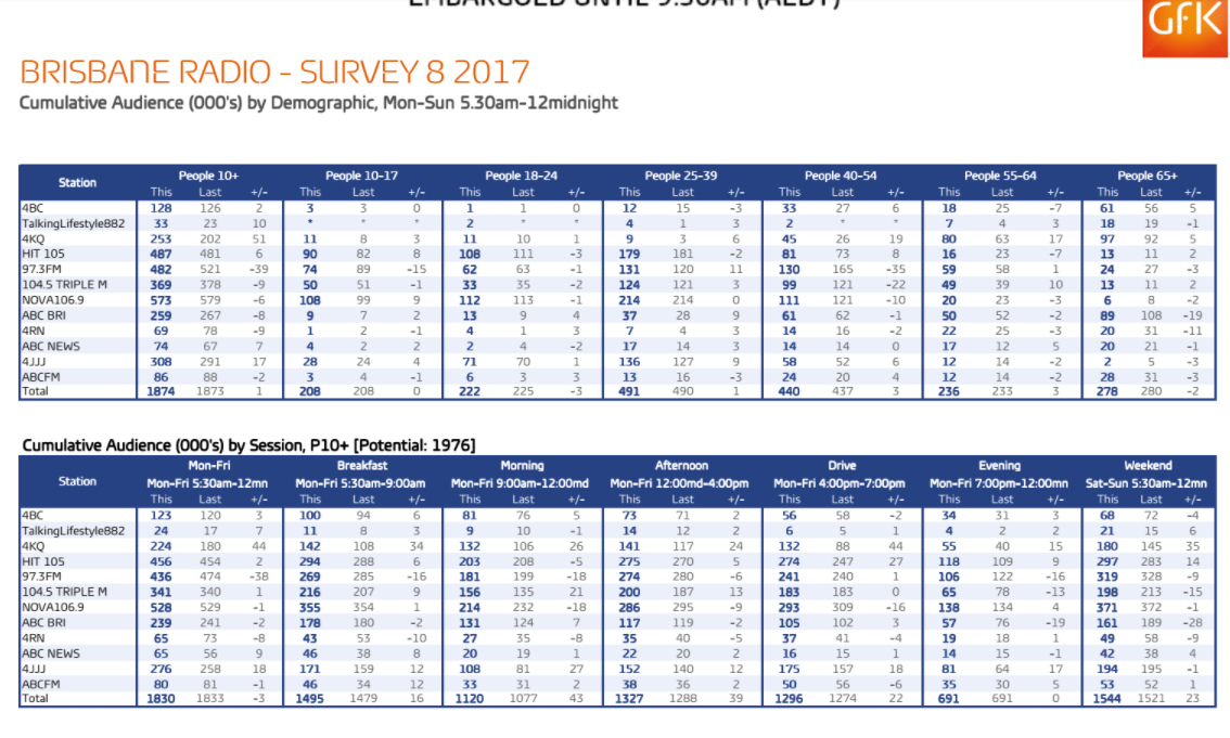 格雷格·马丁和罗宾·贝利的三重M布里斯班早餐以10.1%的份额结束,而97.3FM的比安卡·戴、鲍勃·加拉格尔和特里·汉森以10%的份额结束。